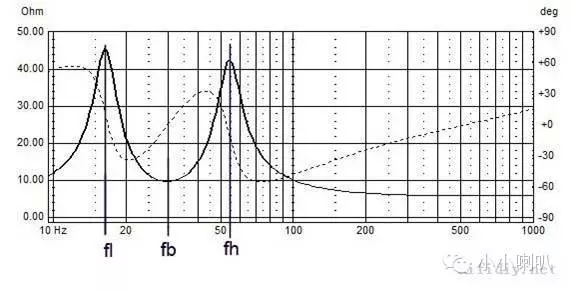 在上圖中,倒相箱的阻抗曲線形成了兩個明顯的峰,兩峰中夾著一個谷,這就是倒相箱阻抗曲線的典型形狀。其中,頻率較低的峰的頻率可記作fl,頻率較高的峰對應的頻率可記為fh,而谷的位置記為fb。fb就是倒相管與箱體共同組成的一個亥姆霍茲共鳴腔的諧振頻率,簡單地說,就是倒相箱的諧振頻率,fb的b就是box的簡寫。(附加一個問題,這個頻率與單元的參數(shù)有沒有關系?)