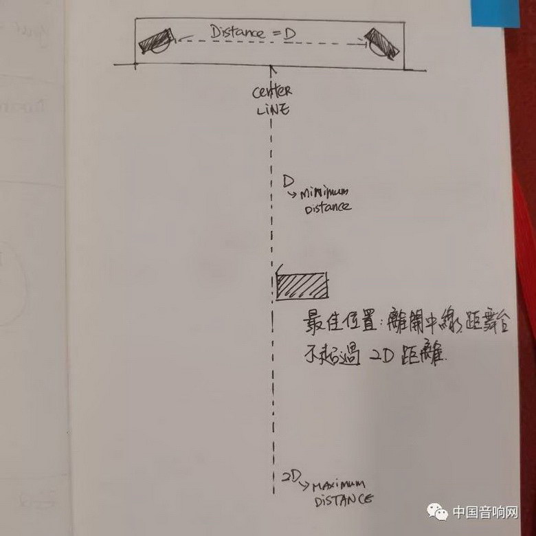 下圖是一個(gè)展演的PA環(huán)境中,現(xiàn)場(chǎng)混音臺(tái)與喇叭的位置關(guān)系示意圖。好的聆聽(tīng)區(qū)域大約就是混音臺(tái)之前的區(qū)域。這個(gè)原理就與在家聽(tīng)兩聲道喇叭雷同了。