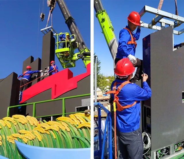 設計方案確定后,明和技術團隊便馬不停蹄進入生產(chǎn)制作階段,面對彩車屏體造型復雜、安全穩(wěn)定性要求高等技術難點以及時間周期壓力,明和項目團隊依托集團領先的研發(fā)實力、創(chuàng)新能力以及高水平技術保障,在極短時間內(nèi)先后攻克了彩車異形高清LED顯示屏的獨立研制、控制系統(tǒng)及配電系統(tǒng)設計創(chuàng)新等難度極高的工作,使其具備獨創(chuàng)性、領先性和穩(wěn)定性等多重亮點。