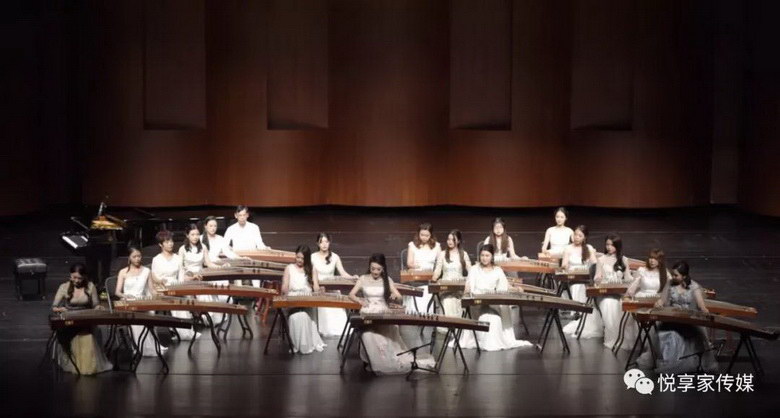 一束追光照在舞臺——蘇老師端坐箏前,沐浴在柔和的光中,裙裾微斜、如弱柳扶風(fēng);只見她臂腕輕抬、手指落處,純凈美妙的箏聲響起,仿如天外來音……