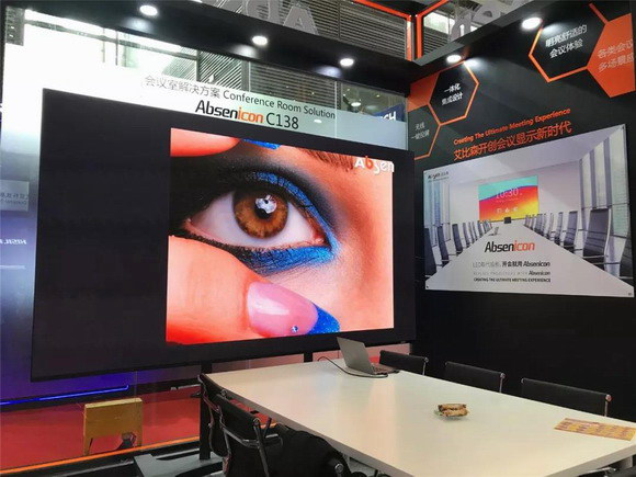 在艾比森展位上,經(jīng)常被人潮覆蓋的一側(cè),艾比森還原了會議室場景,全方位展示了Absenicon。作為近年來最火爆的高端會議解決方案,Absenicon把人從沉悶無聊的會議中解救出來,支持“打開天窗說亮話”。