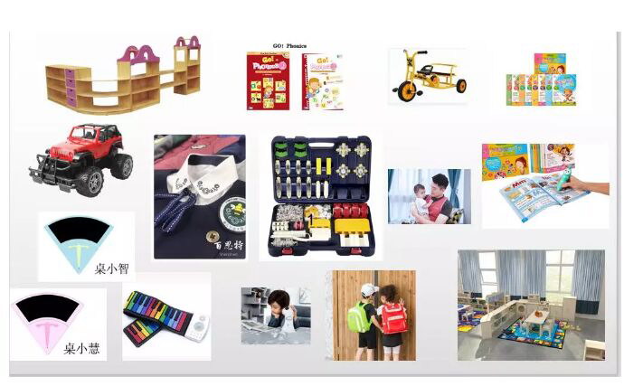 幼兒園圖書、兒童出版物、書包、園服、床上用品、幼兒園餐具、幼兒飯兜、消毒濕紙巾、清潔用品、繪畫用品用具、DIY、橡皮泥、動(dòng)畫音像制品、植物標(biāo)本、手工課程、游戲課程、科學(xué)實(shí)驗(yàn)課程、左右腦開發(fā)教材等;