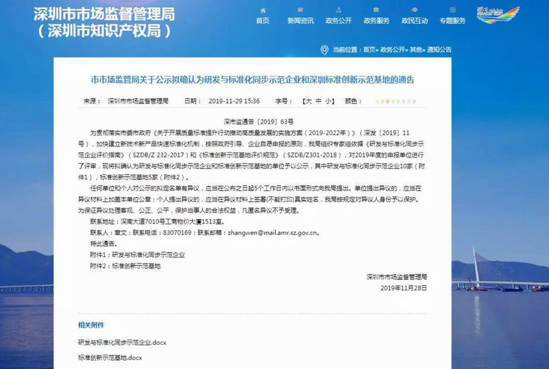2019年11月29日,深圳市洲明科技股份有限公司被深圳市市場監(jiān)督管理局評定為深圳市標準創(chuàng)新示范基地。