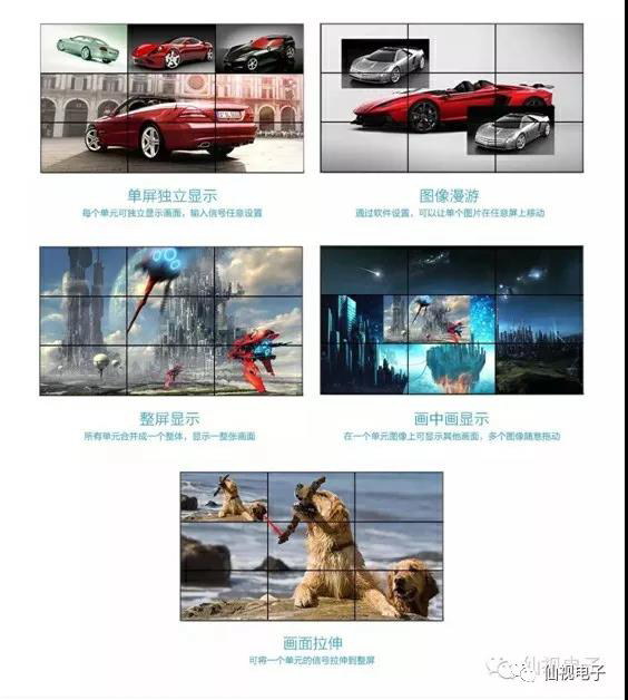 液晶拼接屏可以根據(jù)不同使用需求,實(shí)現(xiàn):?jiǎn)纹练指铒@示、單屏單獨(dú)顯示、任意組合顯示、全屏液晶拼接、豎屏顯示,支持?jǐn)?shù)字信號(hào)的漫游、縮放拉伸、跨屏顯示、畫(huà)中畫(huà)、3D播放,各種顯示預(yù)案的設(shè)置和運(yùn)行,全高清信號(hào)實(shí)時(shí)處理。