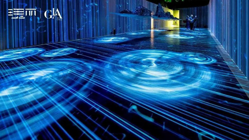 場景開端,金屬質(zhì)感的水滴,擊打在層巒流影的山體。畫面逐漸豐富,多媒體裝置投射出水墨、星辰、浮雕和青綠山水多組特效,觸碰山體將觸發(fā)即時效果,如銀河倒掛、流螢翻飛。