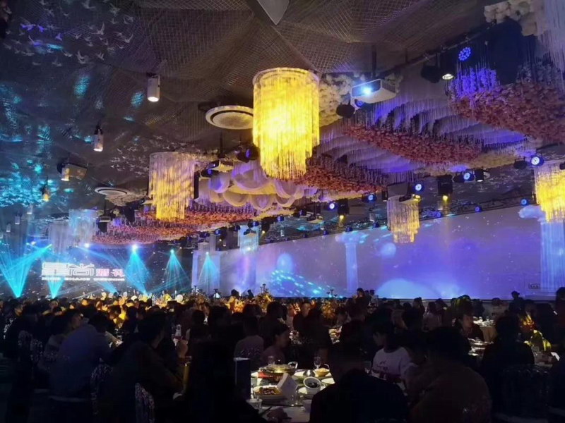 傳統(tǒng)婚禮宴會的布局,為了背景能夠達(dá)到變換的效果,通常使用LED屏幕結(jié)合布景進(jìn)行變化。LED屏幕只能展示平面畫面,不足的屏幕尺寸限制了婚慶創(chuàng)意的施展,搭建布景更是需要耗費大量的物力、人力、時間成本。