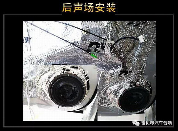 中音和高音安裝于門板和三角位,高音單元可以提升系統(tǒng)的聲場定位感,大大提升聲場環(huán)繞感!后聲場喇叭安裝雷貝琴RV6A,不僅對后面的乘客來說是一種享受,對整個聲場效果來說也是很有好處的,還起到補充的作用,對各頻段的銜接也是大有裨益的。