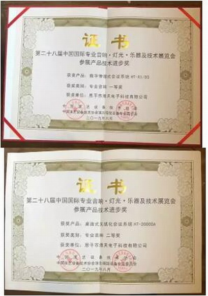 獎項二為產品技術進步獎,參加此項評選的要求較高,參賽產品必須具有自主知識產權和自我品牌,且是近兩年生產投放市場并獲得國內外相關專利證明或權威獎項的產品。海天電子一直致力于科技創(chuàng)新和新產品研發(fā),即使面對這樣苛刻的條件依然信心滿滿,憑借數字伸縮式會議系統(tǒng)HT-X1/03、桌面式無紙化會議系統(tǒng)HT-20000A分別榮獲產品技術進步獎的一等獎和二等獎!
