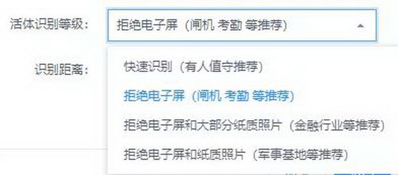 支持用戶自定義活體識別等級,可根據(jù)不同使用場景下對安全等級的不同要求,選擇“快速識別”、“拒絕電子屏”、“拒絕電子屏和大部分紙質(zhì)照片”或者“拒絕電子屏和紙質(zhì)照片”。