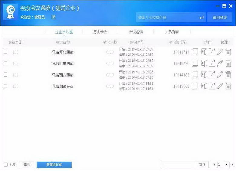 1.賬號成功登陸后,顯示會議室列表。如果是管理員身份登錄,會議列表左下角可以新建和刪除會議室,列表右側可以進行會議邀請、編輯、刪除的操作;如果是非管理員身份登錄,沒有以上權限,則不顯示相關按鈕。雙擊會議室列表中的會議室或點擊 可以登陸到會議室中。