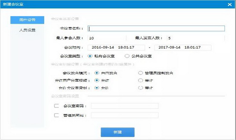 2.新建或編輯會議室界面,可以設置會議室的名稱、最大參會人數(shù)、最大發(fā)言人數(shù)、會議發(fā)言模式、視頻分享權限、會議室錄制權限等。其中發(fā)言模式為“自由發(fā)言”的可以自由申請上麥發(fā)言,為“管理員控制發(fā)言”的,申請后管理員允許才能發(fā)言?梢栽O置會議室的密碼和管理員密碼,會議室密碼設置后,必須輸入密碼方可入會,保證了會議的私密性;管理員密碼設置后,會議中可以通過密碼申請會議管理員權限。