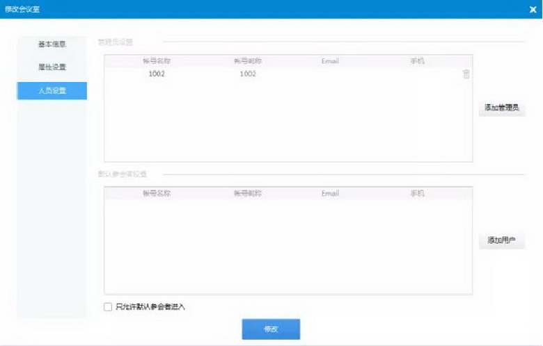 3.點擊會議室信息的【人員設置】,可以添加此會議室的永久管理員。