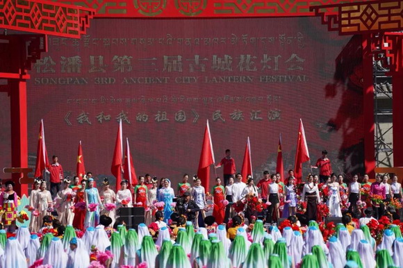 開幕當(dāng)天,明星領(lǐng)唱《我和我的祖國(guó)》,上萬名干部群眾在松州古城進(jìn)行藏、羌、回、漢花燈舞及舞龍、舞獅表演,共慶祖國(guó)生日。此次古城花燈舞松潘縣申報(bào)了海拔最高的花燈舞展演活動(dòng)-“中國(guó)松潘松州古城萬人同跳民族花燈舞”記錄成功認(rèn)證,并現(xiàn)場(chǎng)頒發(fā)了大世界基尼斯紀(jì)錄證書。藏、羌、回、漢等22個(gè)民族交流融合、繁衍生息,勾繪出松潘最美的詩畫,古城非遺節(jié)目巡游,引得眾人駐足觀看。