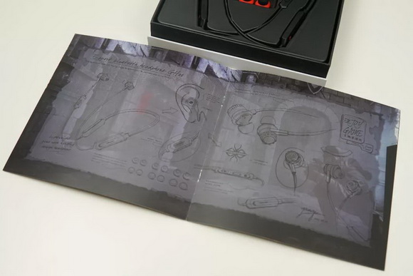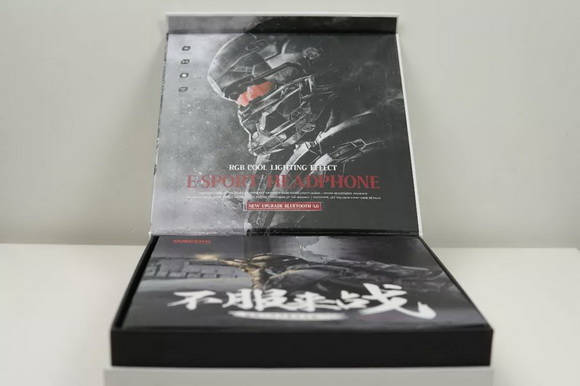 打開盒子第一眼看見的不是耳機(jī)本體而是一本游戲小冊子,里面有游戲插畫還有這款耳機(jī)的設(shè)計(jì)手稿,還是很用心的,這“不服來戰(zhàn)”四個(gè)字讓人看得立刻有“戰(zhàn)斗”激情了,想立刻打開和平精英打上兩局,但是,還是先看東西吧。