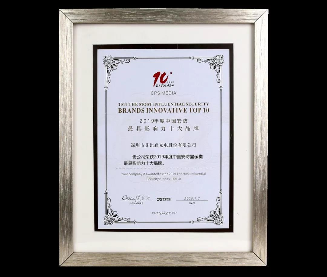 艾比森憑借安防領(lǐng)域的綜合實力及品牌影響力榮獲“2019年度中國安防顯示類最具影響力十大品牌”。