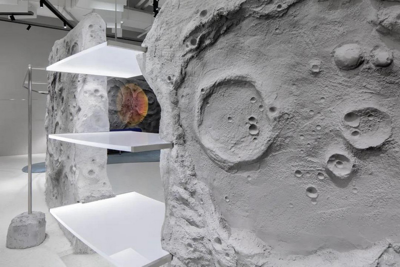 新零售空間當下所截取的“時髦表皮”,往往被自身不斷更迭的產(chǎn)品所傳達出的藝術信息給顛覆。所以,我們選取月球表面和火星影像作為整個空間的基底皮膚,以此抵抗這一悖論所形成的局面。