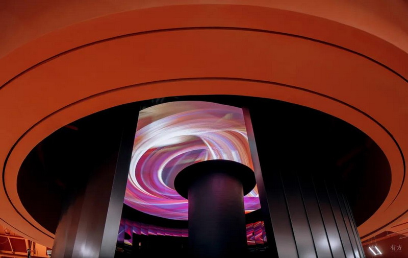 視覺團隊又在樓梯頂部放置了屏幕,在其中注入主題化的視覺內(nèi)容。屏幕被點亮的時刻,畫面被無限反射和旋轉,置身其中的時間旅行者會體驗到一種短暫的扭曲時空感,預示著星際旅程的開始。