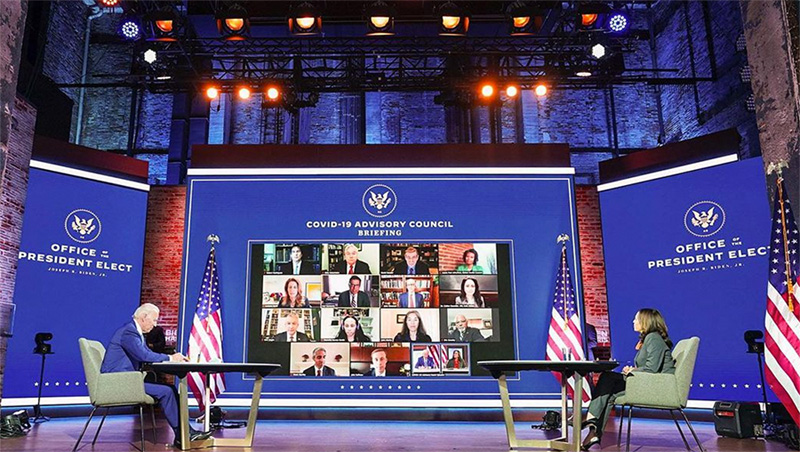遵循于這種新舊結(jié)合的理念,在最終的舞臺(tái)呈現(xiàn)上可以看到,整個(gè)演播室被包圍在傳統(tǒng)建筑的紅色磚墻之中。演播室內(nèi)部,舞臺(tái)上安裝了三面大型小間距LED高清屏幕,以兩側(cè)小,中間大的形式分布,傳統(tǒng)與現(xiàn)代的結(jié)合兼顧了歷史美感與實(shí)用性。大選期間,拜登團(tuán)隊(duì)就在這個(gè)演播室進(jìn)行了一場(chǎng)又一場(chǎng)的新聞發(fā)布、政治會(huì)議、與選民互動(dòng)……并最終取得了勝利。