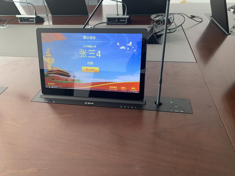 因受新冠疫情影響,目前各個地方醫(yī)院都在積極建設(shè)信息化,此案例是武漢某區(qū)人民醫(yī)院會議室,采用18臺15.6帶話筒同異步升降無紙化外加一臺信息發(fā)布電子顯示屏,此會議室主要功能是來開會人員顯示人名,職位,單位,簽到,上傳文件,投票,同屏服務(wù),呼叫服務(wù)等。