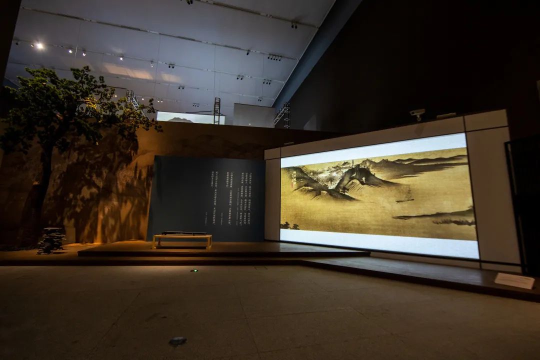 影片對(duì)《瀟湘八景圖》復(fù)刻再現(xiàn),結(jié)合古琴曲《瀟湘水云》,同步設(shè)置音樂(lè)可視化視聽(tīng)演繹互動(dòng)演繹聯(lián)動(dòng)展示,呈現(xiàn)出一幅活化的美景畫(huà)卷。山間石峰錯(cuò)落分布,流水、清潭點(diǎn)綴其間,水流緩慢琴聲悠悠,給人靈動(dòng)的空間體驗(yàn)。