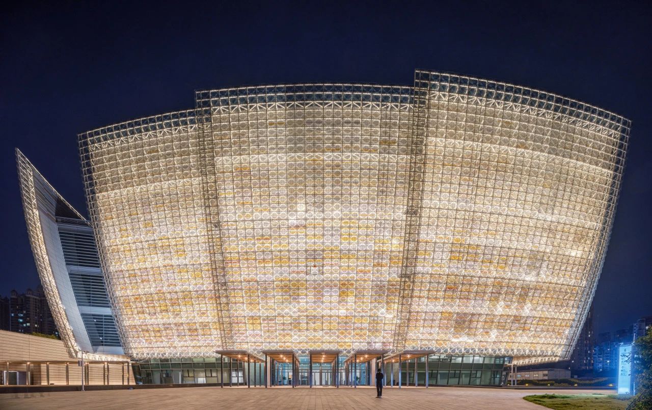 全新開放的廣州美術(shù)館新館,足夠給人一個(gè)“大寫的震撼”。5個(gè)外立面的幕墻如花瓣,白日反射著光影,閃爍著波光粼粼,夜里點(diǎn)亮了燈光,神秘且絢麗。